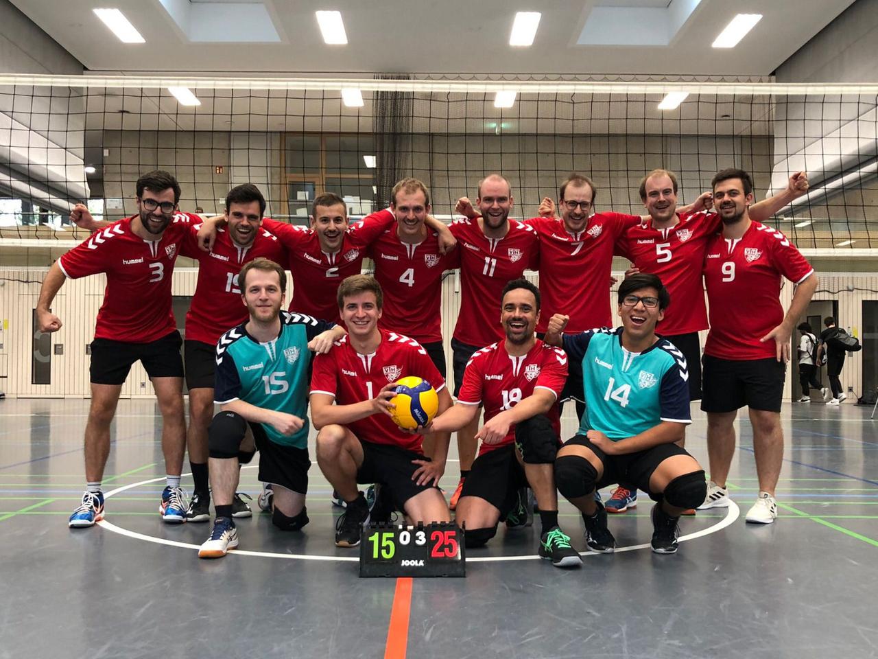 Für den dritten Satz stellten wir nochmal eine andere Startformation auf, doch das Geschehen auf dem Feld blieb ähnlich. Die Spieler der VTH dominierten auch diesen Satz und konnte sich mit 14:4 deutlich absetzen. Danach verloren wir jedoch die Konzentration und machten einige Eigenfehler, weshalb beim Spielstand von 17:9 unser Kapitän Lukas sich gezwungen sah die einzige VTH-Auszeit in diesem Spiel zu nehmen. Vermutlich lag es vor allem daran, dass kaum noch Gegenwehr von den Gegnern kam und die Bank auch bereits in Feierstimmung war. So wurde unter anderem bereits das Lied „VTH - Du bist die große Liebe“ angestimmt. Nach deutlichen Worten in der Auszeit konnten wir den 3. Satz mit 25:15 und somit das Spiel mit 3:0 deutlich zu unseren Gunsten entscheiden.