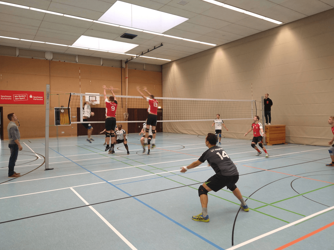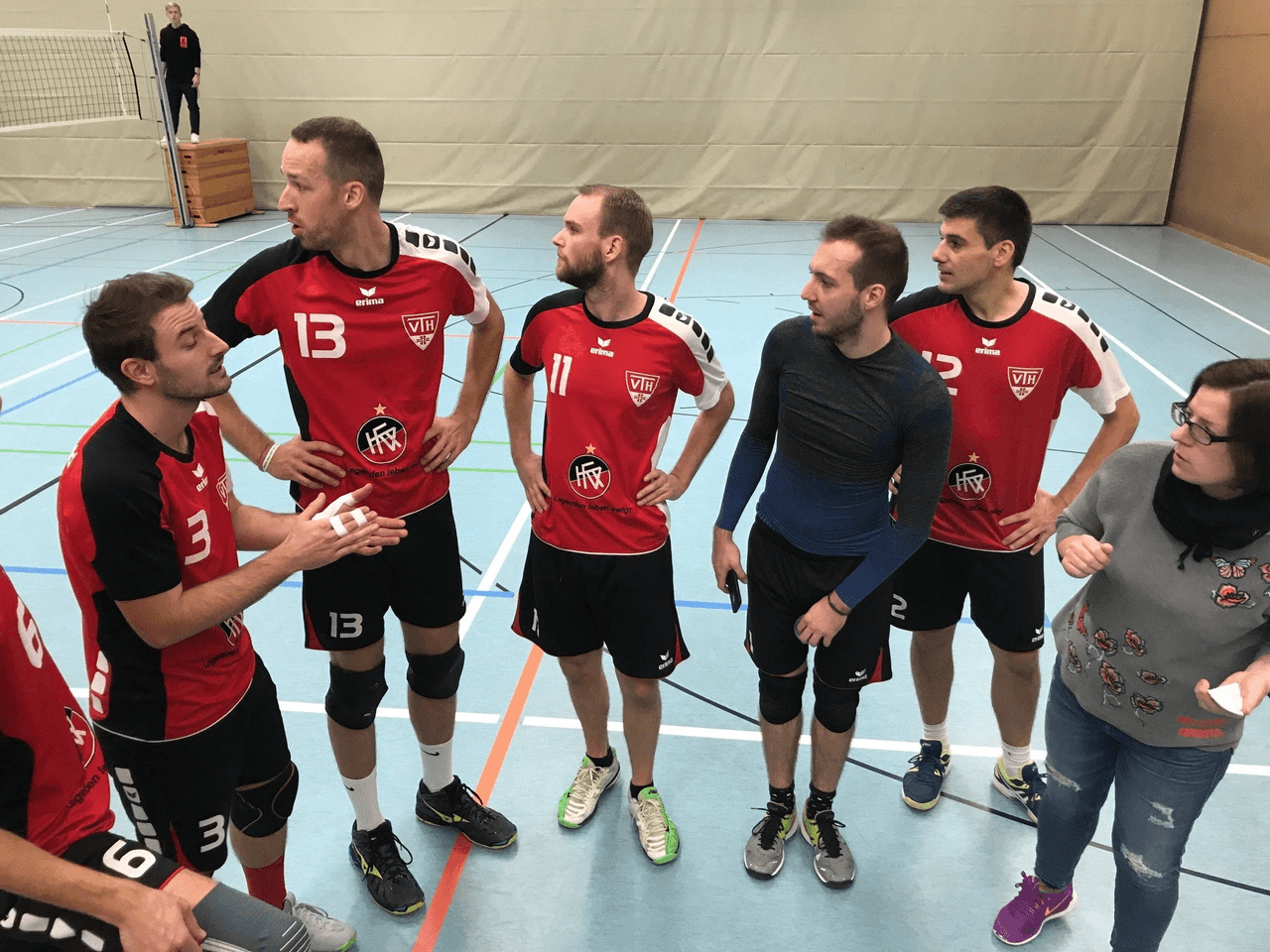 Am zweiten Heimspieltag der Saison, diesmal vor gewohnt heimischem Publikum, erwarteten wir zunächst den SSC Karlsruhe 5. Durch die räumliche Nähe von nur 5 Radfahrminuten Entfernung bedingt, hatte dieses Spiel durchaus Derby-Charakter. Man kennt die Mannschaft und ihre Spieler bestens aus vorangegangen Liga- und Testspielen. Dennoch kommt der angereiste Kader und deren Spielform immer einer Wundertüte gleich. Dementsprechend hoch war die Motivation die Machtverhältnisse früh und konsequent abzustecken. Mental und körperlich bestens vorbereitet, ging der gesetzte Plan augenscheinlich auf. Die ersten beide Sätze konnten durch eine starke Präsenz im Angriff und deutlichem Größenvorteil fast kampflos errungen werden. Die Stimmung war gut, fast ausgelassen. Vielleicht hingen bei dem einen oder anderen Spieler die Gedanken schon bei den angekündigten Erfrischungsgetränken während der greifbaren Spielpause. Aber das wäre spekulativ. Man wähnte den glatten 3:0 Sieg bei einem zwischenzeitlichen Spielstand von 18:11 für den VTH schon in trockenen Tüchern, da konterte der SSC plötzlich mit starken Aufschlagserien und einem bis dahin nicht existierenden Angriff. VTH-Kapitän Max S.: „Mit einem Mal lagen die Nerven blank. Nichts wollte mehr funktionieren!“. Die, im Vergleich zu den vorangegangen Satzpausen, nun deutlich energischere Rede der Trainerin konnte den weiteren Spielverlauf zunächst nicht verändern. Der SSC5 spielte jetzt in Topform. Der VTH hatte Mühe Akzente zu setzen, blieb aber in Schlagweite. Die Spannung war Fans und Spielern ins Gesicht geschrieben. Beim Rückstand von 19:23 pro SSC5 wurden bereits erste Vorbereitungen für den fünften und finalen Satz getroffen. Doch der VTH wollte sich damit nicht abfinden. Nach einer hochemotionalen Kurzrede des ehem. Spielführer Filip. P. im Spielerkreis auf dem Spielfeld, gelang es das Spiel auf 24:24 auszugleichen. „Das war der Wendepunkt!“ bedankte sich Felix S. später beim Redner. Per Monsterblock konnte der letzte Punkt zum 26:24 erkämpft und die trotz allem volle Punkteausschöpfung gebührend gefeiert werden.